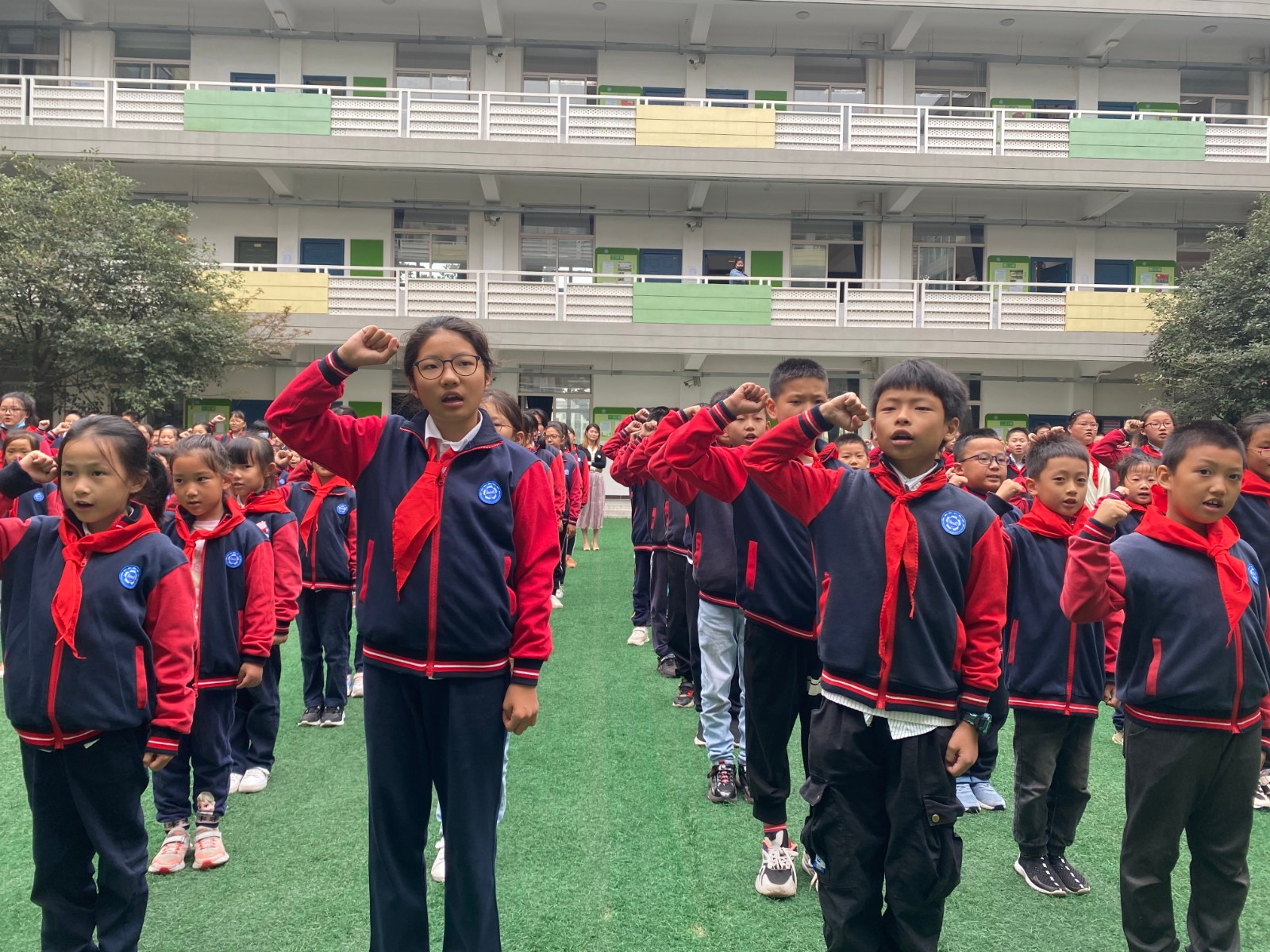 接着,少先队大队辅导员杨艳老师带领全体队员呼号。从队员们坚定的眼神中,我们看到了祖国的希望和未来。