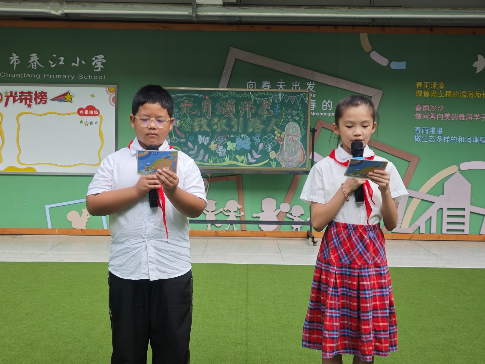 “饮其流者怀其源,学其成时念吾师”。在朗诵之后,五 2 中队的队员们又带来了歌曲《有你就幸福》。悠扬的旋律响起,队员们用清澈的歌声,唱出了对老师的感恩:感恩老师如红烛般燃烧自己,传播智慧火种;感恩老师在无数个不眠之夜伏案备课,用爱拉近心与心的距离;感恩老师像人生台阶,托举着学子一步步踏实向上。歌声里满是童真与真诚,感染着在场的每一个人。
